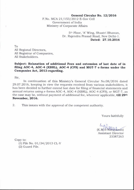 Last date for filing of Financial Statements and Annual Returns under the Companies Act, 2013 using eforms AoC-4/AoC-4 (XBRL)/AoC-4 CFS or MGT-7 as the case may be without payment of additional fee wherever applicable has been extended till 29th November 2016. Stakeholders may plan their filings accordingly.
